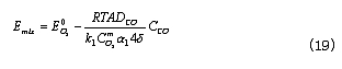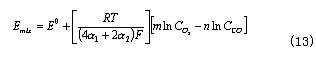 在COCO浓度对数呈线性关系。2一定的条件下,Emix也与如果在氧气的电化学反应为电荷传输过程控制,且过电位较大,而CO的氧化反应由扩散极限控制,那么联立等式(4)、(6)、(9)和(11),得到平衡混合电势为: