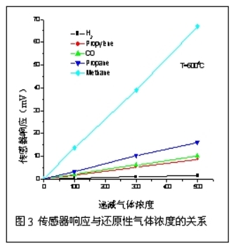混合电势传感器受电极材料、电极形貌以及固态电解质类型的影响。许多基于Pt、Au电极和YSZ电解质的混合电势传感器在高于400℃的温度下工作,但是Au电极在高温下会迅速再结晶长大而失去催化活性,这使得传感器在高温工作时没有长期稳定性。电极的长期热、化学稳定性和大规模制备可重复的传感器结构是混合电势气体传感器的主要障碍,用耐高温并具有良好活性的氧化物电极材料取代金属电极为改进传感器选择性和长期稳定性提供了前景。