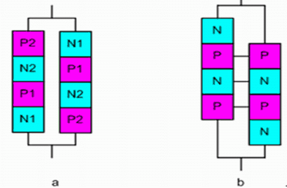 图5 非平行的晶闸管 a) 一对非平行的晶闸管 b) 集成于单个硅器件的非平行的晶闸管