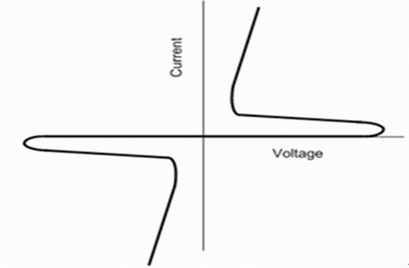 在图4中可以看到一个简单的晶闸管的?;ぬ匦允呛懿欢猿频摹T诘缪怪岬恼较蚓д⒐艿纪ɑ岬贾碌缱杓本缂跎?,而在电压轴的负方向晶闸管会发生电位钳制的动作,相当于一种基于TVS器件的二极管。为了具备对称的过压保护功能,我们必要使用两个反平行的晶闸管。这可以由一对不连续的晶闸管来实现,如图5a所示;或者可以由五种不同掺杂浓度的P区或N区组成的硅器件来实现,如图5b所示那样,这种器件一般就被叫做晶闸管浪涌保护器件(TSPD),它的电流-电压曲线特性如图6所示。