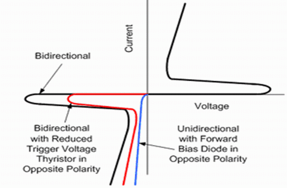 大多数晶闸管浪涌?;て骷?TSPD)是对称的双向特性的,但也有内含二极管单向特性的,如图7所示。而不对称的双向晶闸管浪涌?;て骷?TSPD)是在一个极性方向有着减小了的触发电压,如图7所示。