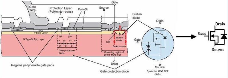 在MOS管原理图上可以看到,漏极和源极之间有一个寄生二极管。这个叫体二极管,在驱动感性负载(如马达),这个二极管很重要。顺便说一句,体二极管只在单个的MOS管中存在,在集成电路芯片内部通常是没有的。下图是MOS管的构造图,通常的原理图中都画成右图所示的样子。 (栅极?;び枚苡惺辈换?