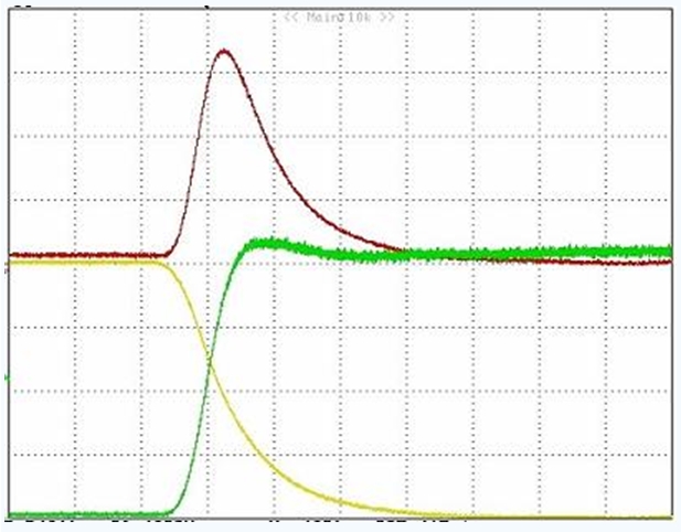 下图是MOS管导通时的波形??梢钥闯?,导通瞬间电压和电流的乘积很大,造成的损失也就很大。降低开关时间,可以减小每次导通时的损失;降低开关频率,可以减小单位时间内的开关次数。这两种办法都可以减小开关损失。