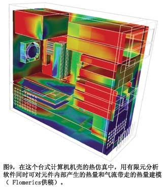 美国国家半导体的Webench在线设计工具采用Flomerics的Flotherm热分析软件,计算静止空气中的器件温度。所有一般的仿真注意事项均适用。如果你的电路有风扇和一些气流,其温升就较低。如果有机箱,里面还有其它器件,其温升就高。Flomerics采用有限元方案技术(参考文献5)。图9显示了一个计算机机壳发热与气流的分析结果。很多其它有限元解算器也可以分析这种问题。例如,Comsol的一个解算器可以完成多重物理分析,可以解算超过一个问题的偏微分方程,如一只部件的热响应,部件的导热性能随其温度而变化。TI的Edwards指出,他的公司提供二种级别的热建模抽象:ΦJB热阻,以及Delphi紧凑模型标准。Flotherm、Icepak和很多其它热分析程序都使用这些模型。