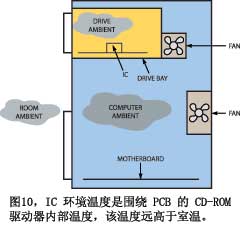 无疑,当大多数工程师没有理解环境温度的嵌套程度时,他们就会失败。例如,假设要设计一个部件,用于CD播放机的光学拾取装置(图10)。你可能会这么假设,由于该部件用于消费产品,它可能工作在0℃~70℃。但好好想想吧。实验室工作台上的部件可能是工作在25℃环境下。而光功率件是要安装在CD驱动器里,驱动器中有其它元件在加热空气,该装置可能不装风扇。更糟糕的是,播放机装在计算机内,驱动器必须工作在这种环境温度下。计算机内部有自己的热源和风扇,这个温度上再加上外部环境温度,因此,在工作台上测得的25℃室温,到了计算机内就是40℃,CD驱动器内是50℃。现在,如果你把计算机放在厄瓜多尔的一个很热的阁楼上,情况又该如何?这个部件必须工作在远高于70℃的环境温度下。你的职责是确保它仍能满足规范,并且高温不会显著缩短产品的寿命。