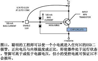 ESD方法虽有价值,但也有限制。如果IC提供数百毫安电流,则在VCC或接地的金属线和连接线内部就会有电压降。这些电压降可能对ESD二极管电压的测量值有增、减作用。你应该向应用小组,甚至IC设计者咨询是否会出现这种情况。为抵消电压降,可以在测量时停止供电。注意硅片的发热时间常数是微秒级,因此你必须用一台快速示波器或采集系统测量,保证测到的不是二极管已经冷却后的ESD二极管正向电压?! ?br />