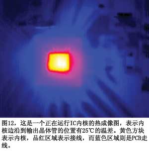 有关ESD二极管方法的另一个担心是,IC芯片并不是等温的,即它们在空间和时间上都不具备相等或恒定温度。测量ESD二极管时并不能永远保证测到的是内核的最热点。这里关注的是ESD二极管,它总是在芯片的边沿,低于输出晶体管的温度。你可以获得IC工作时的IR热成像图(图12)。图中明亮的白点比ESD二极管所在的内核边沿高25℃。当器件工作在高温下时,可能需要降级使用(参考文献8)。在150℃时,器件可能不能满足电路的要求。
