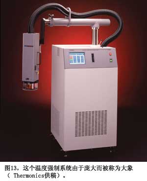 做测量只是检查真实情况,验证自己的假设与估算的一个部分。如果没有可用的环境温度,你还必须自己创造出来。汽车公司会在亚利桑那州和加拿大做跟踪测试,对于电子测试,采用台面测试室或温度强制系统,如Thermonics的T-2500E型(图13)。要确保使用的电缆和测试线可以承受热量。BrownBNC电缆有较高的额定温度,优于更常用的黑色U58型线(参考文献9)。热风枪的快速气流就可以加热IC,但要小心,IC可能很容易被热风枪毁坏。制