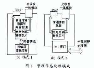 收发器网管功能的实现有两种方式:一种是在收发器电路板上配置网络管理信息处理器——可编程逻辑芯片来处理网管信息,该芯片利用OEMC上的双向管理指令接口(Managenent Data Input/Output,MDIO)、管理数据同步时钟输入接口(ManagenentData Clock,MDC)及被管理信息输入/输出管脚等接口来获取管理信息,管理信息与网路上的普通数据共用数据通道,如图1(a)所示。第二种方式如图1(b)所示,收发器上没有管理信息处理器,收发器外部的网络管理者通过MII接口获取管理信息??杉?,有网管功能的收发器,其元器件种类及数量远远多于无网管收发器,相应地,其布线复杂,开发周期长。