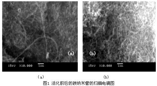 碳纳米管一般是由为数众多的芳香不定域碳原子组成的极端疏水的大分子,几乎不溶于任何溶剂,并在溶液中较易聚集成束,这些特性限制了碳纳米管本身所具有的作为电极材料的优良特性。所以在制备电极之前,材料的活化处理很重要,本文以强氧化性的20%硝酸溶液浸泡处理多壁碳纳米管25min,可以充分浸润碳纳米管阵列,从而使离子嵌入碳层,产生利于电容性的孔结构。并能溶解由前躯体处理造成溶解在管上的铁、镍催化剂和其他酸溶性的杂质。