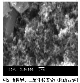 图2是活性炭/二氧化锰复合电极的SEM图。从图中可以看出,电极具有疏松的表面孔结构,这种特有的结构可以为在电极表面发生的双电层反应和法拉第赝电容反应提供良好的环境。