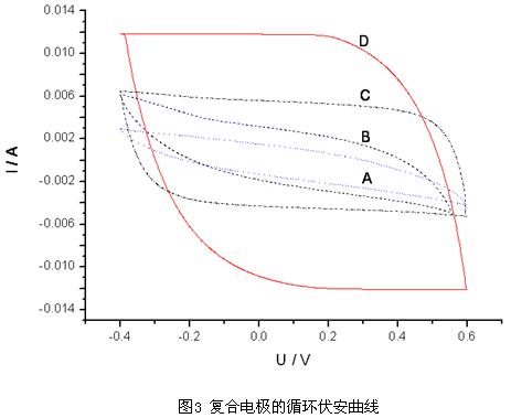 图3是上述复合电极的循环伏安曲线??梢钥闯?,复合电极表现出了良好的可逆性,具有明显的电容特征。比较电极A、B和C可知,随着碳纳米管含量的增加,循环伏安曲线所包围的面积逐渐减小,电容量也逐渐减小。这是由于碳纳米管虽然是一种高比表面积的材料,但是在双电层电容中,碳材料主要是通过可逆的吸附电解液离子在电极表面形成的双电层来完成储能过程,双电层的厚度取决于离子半径和电解液的浓度。而碳纳米管的内径一般在20nm~60nm之间,此范围内较小的内径对于电解质离子来说进入困难,所以导致微孔只对材料的比表面积做出了贡献,并没有对电容的提高起到应有的效果[5]。而活性炭的孔径比碳纳米管大,有利于电解质离子在其表面的吸附与脱附,从而复合电极随着活性炭含量的增加,循环伏安曲线所覆盖的面积也相应增加。