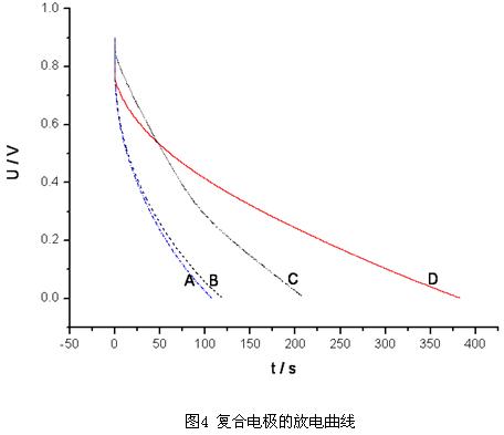 图4给出了各电极在恒定电流为2mA的情况下的放电曲线,可以看出各电极均具有良好的线性放电性质。由公式(1)计算得出A、B、C和D四种电极材料的比电容分别为51.3F/g、56.2F/g、93.2F/g和126F/g。由上节分析可知,双电层和法拉第赝电容的共同作用,提高了活性炭/二氧化锰复合电极的容量,同时也表现出了良好的放电特性。在对电容容量的贡献上,二氧化锰的作用要优于碳纳米管。