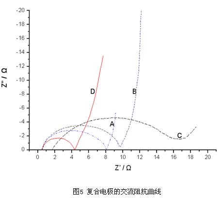 此外由图5也可以看出,当电极中碳纳米管的含量增加时,传递电阻呈现递减的趋势。这是由于碳纳米管在导电性上具有活性炭不可比拟的优点:碳纳米管可以看成是六边形的石墨层在空间通过360°卷曲而成,随着在电极中含量的增加,碳纳米管交织缠绕的程度增大,为电解液离子提供了良好的导电通道。因此,随着含量的增加,阻抗圆的半径减小,使得复合电极材料的阻抗特性越好。