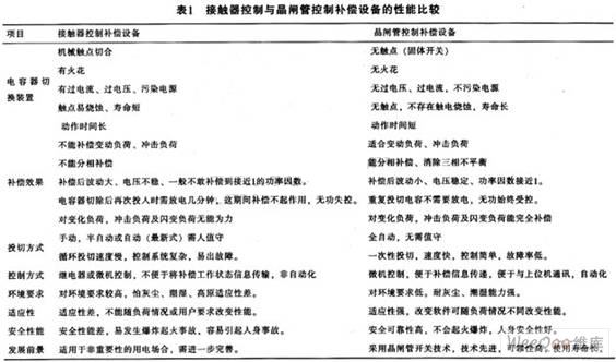 利用接触器控制补偿设备与用晶闸管控制方法来补偿设备的性能比较如表1所列。