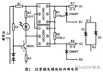 由于切除的电容器上一般都有剩余电压,而电容器两端的电压不能突变,因此,当系统电压和电容器残压的差值较大时,触发晶闸管会产生很大的冲击电流,而可能直接损坏晶闸管。为了实现动态无功补偿装置快速响应,同时又保证投切无冲击电流,因此需要检测电容器电压和电网电压。只有当两者大小相等、极性相同时,才能瞬时投入电容。因此需要加装过零触发??椤D壳?,从晶闸管两端取得过零信号的典型触发电路是MOC3083。MOC3083芯片内部有过零触发判断电路,它是为220V电网电压设计的专门芯片,其芯片的双向可控硅耐压为800V。在4、6两端电压低于12V时,如果输入触发电流,其内部的双向可控硅导通。图1所示是用在380V电网的TSC电路上串联两只MOC3083的过零触发??榈哪诓康缏吠?。