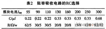 ??楣贡;ひ话阋部刹捎米枞菸辗?。对于持续时间较短,能量不大的过电压,一般可在模块两端并联阻容吸收电路,用吸收电容把过电压的电磁能量变成静电能量存贮起来。而用吸收电阻不但可以防止电路振荡,还可限制晶闸管导通时电容放电所产生的开通损耗和di/dt值。并联在晶闸管开关??榈腞C值可参考表2。