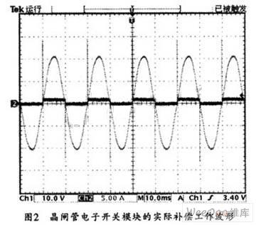 在无功补偿实际应用中,可将晶闸管电子开关??橛迷赥SC低压无功补偿以替代接触器,这样,就可以在开关电压过零时投入补偿电容量,从而避免了冲击电流的产生和瞬间电网电压的波动。图2所示是其工作波形图。