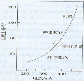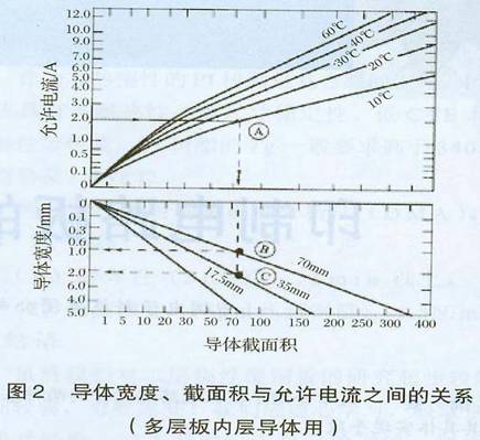 值得注意的是,当导体图形温度上升到85℃左右时,绝缘材料自身开始发黄(图1),电流继续通过,最后铜图形熔断,特别是多层板内层图形,周围都是传热性差的树脂,散热困难,因而温度不可避免地上升,所以特别要注意导体图形线宽的设计。实际上在进行PCB布线设计时走线线宽主要依据其发热量和散热环境来确定的。铜导体的截面积决定了导线电阻(数字电路中线电阻引起的信号损耗可忽略不计),铜导体和绝缘基材的导热率影响温升,进而决定载流量。图2是普通FR-4覆铜箔板铜导体图形线宽及截面积与允许电流之间的关系图。从图中可以看出:导体图形截面积一定,当其允许电流值为2A,温度上升值低于10℃时,对于35Um铜箔,其线宽应设计为2mm:对于70um铜箔,其线宽应设计为lmm。由此得出:当导体的截面积、允许电流和温度上升值一定时,可通过增加铜箔厚度或加大线宽值两个方面来满足走线的散热要求。