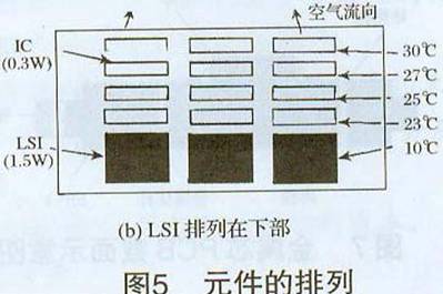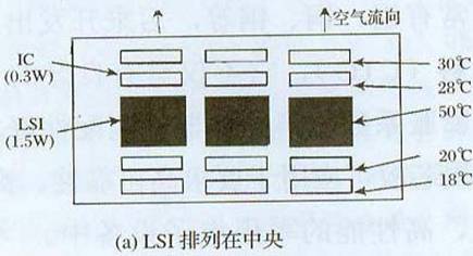 热性能相同发热元器件布置:图5显示PCB上安装IC(0.3W),LSI(1.5W)时温度上升的实测值。按图5(a)排列,IC的温度上升值是18℃-30℃,LSI温度上升值是50℃。按图5(b)排列,LSI温度上升值是40℃,比图5(a)排列还要低10℃。