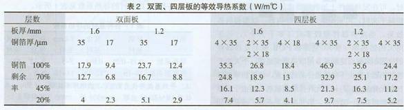 从表2我们可以看出板厚度越小,铜箔越厚,铜箔剩余率越高,层数越多,其等效导热系数越大,PCB板的导(散)热效果越好。