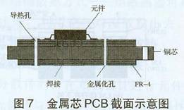 金属板嵌入多层印制板的中间,其典型结构如图7金属芯板本身也可作为地层使用,其上下层可通过金属化孔(与芯板绝缘)互联,并通过导热孔实现热量在金属芯板内层和表面的传递。如图7所示,发热元件可通过底部和导热孔直接焊接在板面上,发热器件产生的热直接传递到金属芯板,由金属芯板经导热孔传给接触的安装机箱而散发出去;热量较大时可铣去芯板两边的绝缘层,通过边缘裸露的金属芯板与机座接触散热,因此具有良好的散热效果。对处于密闭机箱中的电路散热是一种较好的选择金属芯PCB的芯材通常有铝、铜、钢等,后来开发出了覆铜因瓦复合材料(CIC),它不仅具有良好的导热性,而且其热膨胀系数与半导体器件匹配性好,所制成的CIC金属芯板可应用于要求高可靠性、高组装密度、高功率、高性能的军用电子设备中。