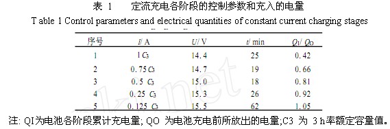 (2) 减小各段恒流值下降梯度 。通过试验确定该型电池初次恒流值I (1) ,并减小阶段恒流充电的电流下降幅度 。如果降低充电电流后 ,达到充电终止容量梯度值的时间很短 (设定一个最小充电时间) ,则适当增大电流下降的幅度 。