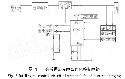 分段恒 流 充 电 智 能 化 控 制 电 路 如 图3 所示。该电路采用 CPU 控制 ,可对充电电池和充电环境温度进行检测 ,对电池充电进行计时 ,采样充电过程中电池的电压和电流 ,对分段恒流充