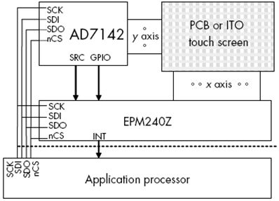 参考设计有一个简单的数据解释程序,演示并测试多触点传感器的工作。AD7142 CDC用于监测电容变化,只有14个电容传感器通道。在这一参考设计中,MAX IIZ CPLD扩展了AD7142 CDC的功能,使其能够处理两维ITO薄膜和PCB触摸传感器。应用处理器通过SPI或者I2C总线访问AD7142的CDC寄存器文件,将MAX IIZ CPLD的SRC信号控制设置在合适的轴上。长时间暂停后,触摸屏监测到一次触摸时,MAX IIZ CPLD会产生一个中断信号。