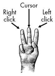 图1(b)中的传感器可实现计算导航板,从而避免了使用普通导航板所需要的选择按钮。如图2所示,中指移动光标,食指和无名指触摸屏幕,指示鼠标左键或者右键点击。去掉移动部分后,电容触摸屏传感器比按键和按键开关更耐用。