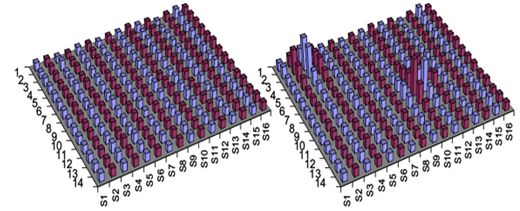 图4:电容数字采样2D阵列表示:基线(左)和触摸后的结果(右)
