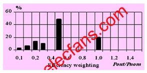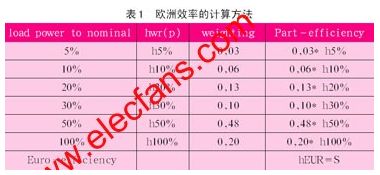 对于传统电力电子装置的设计,我们通常是通过每千瓦多少钱来衡量其性价比的。但是对于光伏逆变器的设计而言,对最大功率的追求仅仅是处于第二位的,欧洲效率的最大化才是最重要的。因为对于光伏逆变器而言,不仅最大输出功率的增加可以转化为经济效益,欧洲效率的提高同样可以,而且更加明显。欧洲效率的定义不同于我们通常所说的平均效率或者最高效率。它充分考虑了太阳光强度的变化,更加准确地描述了光伏逆变器的性能。欧洲效率是由不同负载情况下的效率按照不同比重累加得到的,其中半载的效率占其最大组成部分(见图1)。