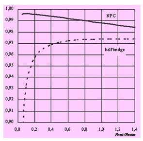图12 npc逆变桥输出效率(实线)和半桥逆变效率(虚线)比较