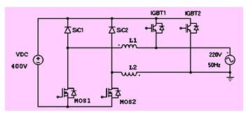 在图13中,上桥臂igbt的开关频率一般设定为电网频率(例如50hz),而下桥臂的mosfet则工作在较高的开关频率下,例如 16khz,来实现输出正弦波。仿真显示,这种逆变器拓扑在2kw额定功率输出时,效率可以达到99.2%。由于mosfet内置二极管的速度较慢,因此 mosfet不能被用在上桥臂。