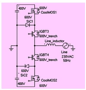 这种拓扑只使用了两个600v的sic二极管(d4,d6)。d3和d5采用快速si二极管,d7和d8采用小型si二极管,用来防止sic二极管过压损坏。