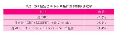 图16所示拓扑结构允许纯无功负载,能够提高对电网的无功补偿,也能满足双向功率流动,例如实现高效电池充电。如果应用sic肖特基二极管,这种电路拓扑将可以达到更高的效率等级。表2是2kw额定功率下不同拓扑结构的欧洲效率