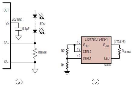 调节LED的电流最简单的方法就是改变和LED负载串联的电流检测电阻(图2a),几乎所有DC-DC恒流芯片都有一个检测电流的接口,是检测到的电压和芯片内部的参考电压比较,来控制电流的恒定。但是这个检测电阻的值通常很小,只有零点几欧,如果要在墙上装一个零点几欧的电位器来调节电流是不大可能的,因为引线电阻也会有零点几欧了。所以有些芯片提供一个控制电压接口,改变输入的控制电压就可以改变其输出恒流值。例如凌特公司的LT3478(图2b)只要改变R1和R2的比值,也可以改变其输出的恒流值。