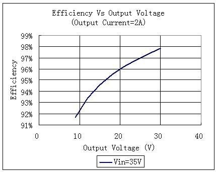 图中的输入电压为35V,输出电流为2A,当输出电压为30V时,效率可以高达97.8%。但是当输出电压降低到20V时,效率就降为96%;当输出电压降低为10V时,效率就降低为92%。在这三种情况下,尽管其输出功率依次为60W,40W和20W,但是其损耗功率却依次为1.2W,1.6W,1.6W。后两种情况下功耗增大了33%。假如恒流??榈纳⑷认低成杓频梅浅A俳纾黾?3%的耗散功率就有可能会使芯片的结温升高,以致发生过温保护而无法工作,严重时也有可能使芯片烧毁。