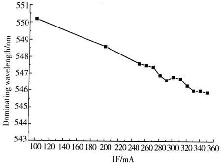 当正向电流为350mA时,主波长为545.8nm;当正向电流减小为200mA时,主波长为548.6nm;当正向电流减小为100mA时,主波长为550.2nm。
