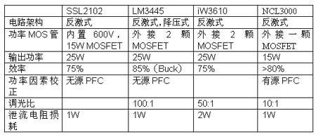 目前市场上主要有恩智浦的SSL2101/2,国半的LM3445,iWatt的iW3610和OnSemi的NCL3000四种兼容可控硅调光的驱动IC。其特点如下: