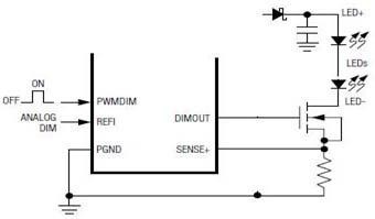 具体实现PWM调光的方法就是在LED的负载中串入一个MOS开关管(图8),这串LED的阳极用一个恒流源供电。