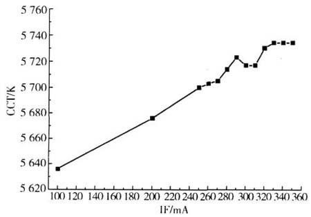 由图4可知,当正向电流为350mA时,色温为5734K,而正向电流增加到350mA时,色温就偏移到5636K。电流再进一步减小时,色温会向暖色变化。