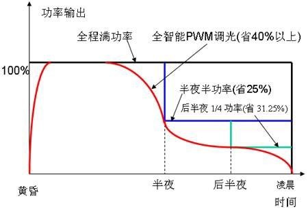 一般来说,路灯到半夜以后就没有什么用处了,所以通常的做法是12点以后关灯或者开一半亮度。但是最合理的做法是根据交通流量来控制路灯的亮度,甚至是完全自适应地控制亮度。图10就是根据当地交通流量的统计值来调节路灯亮度的一个例子。