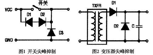 图1中的二极管用于抑制高压开关的尖峰电压。图2是典型的变压和整流电路,D2是肖特基或齐纳二极管,用于抑制滤波后的尖峰瞬态噪声电压。