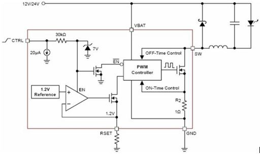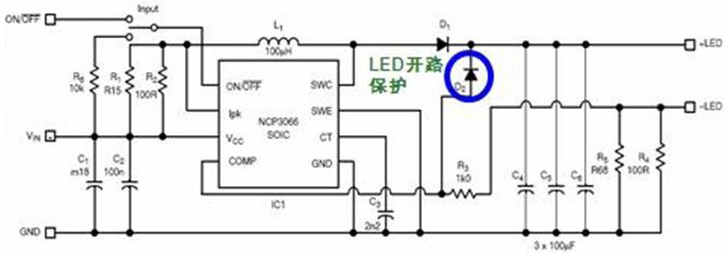图5:基于NCL30010的1-30 W DC-DC LED降压应用