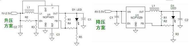 图3:基于NCP1421的升压型和基于NCP1529的降压型1-3 W手电筒LED应用