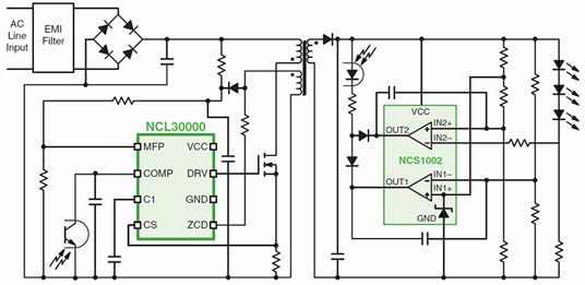 如前所述,为低功率LED照明应用选择适合的驱动器须考虑众多因素,这其中,有关功率因数等行业标准尤为重要。接下来,我们将以安森美半导体的几款低功率LED通用照明驱动方案为例,探讨如何在低功率照明应用中提供高功率因数。