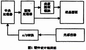 亮度感应自动控制的基体方块由光感应器、A/D转换、CPU、图形处理器、亮度控制模块、液晶面板等组成。根据周围环境的亮度状况,光感应器输出一定值的直流电平,该直流电平信号通过A/D转换成数字信号,并送到CPU。一方面由CPU根据程序的设定,输出特定周期和占空比的PWM方波信号,经过滤波和整形之后,变为一定的直流电平,作为亮度控制??榈牧炼瓤刂菩藕?,再由亮度控制模块改变液晶面板灯管的电流,从而改变液晶面板的亮度大小;另一方面CPU根据程序的设定,调整图形处理器的亮度寄存器值,从而改变输出到液晶面板的数据亮度的大小。从图像处理器输出自适应亮度数据信号和自适应的亮度控制信号到亮度控制??椋佣钪帐迪侄砸壕У缡拥母杏ψ远刂?。如图1所示。