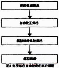 亮度感应自动控制的软件架构主要包含亮度数据采集、实时监测技术、自动校正算法和模拟迟滞比较算法。亮度数据采集是通过光感应器感应周围环境的亮度,将亮度信号转换为模拟电信号,再由ADC转变为数字信号,此数字信号再送到液晶电视的CPU进行处理。通过亮度数据采集到的数字信号,送到CPU进行自动校正算法处理;然后再进行模拟迟滞比较算法得到稳定的PWM信号;由控制背光亮度??榭刂埔壕姘宓谋彻狻H缤?所示。