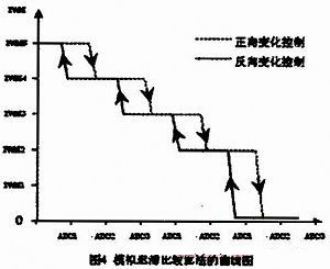 亮度感应自动控制的模拟迟滞比较算法将PWM的背光控制分成五段,四个模拟迟滞比较算法控制。每个模拟迟滞比较器有两个阈值ADC值,分别称为正向阈值ADC和负向阈值ADC。在环境亮度输入信号从低电平(暗)上升到高电平(亮)的过程中使PWM电路状态发生变化的输入ADC称为正向阈值ADC,在输入信号从高电平(亮)下降到低电平(暗)的过程中使PWM电路状态发生变化的输入ADC称为负向阈值ADC。例如ADC2是正向阈值ADC,ADC1是负向阈值ADC,在环境亮度输入信号从ADCI低电平(暗)上升到ADC2高电平(亮)的过程中,使PWM状态由PWN5转变为PWM4;在环境亮度输入信号从ADC2高电平(亮)下降到ADC1低电平(暗)的过程中,使PWM状态由PWN4转变为PWM5。这样设计成阻止环境亮度输入信号出现微小变化(低于某一阈值ADC)而引起输出PWM的改变,确保稳定的液晶面板背光控制。如图4亮度感应自动控制的模拟迟滞比较算法的曲线图所示。